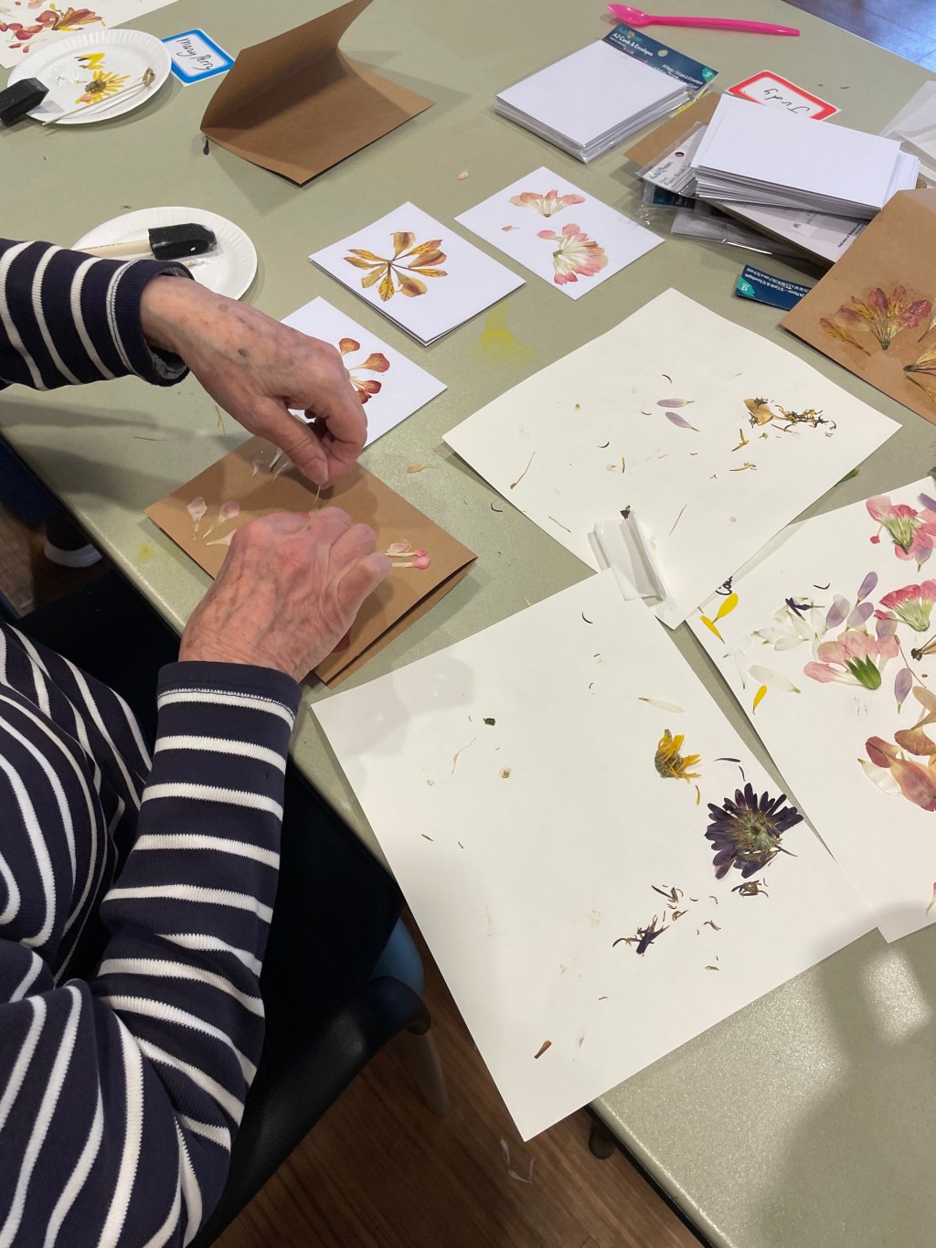 Reading Virginia Evan’s book, “The Correspondent” reminded me how much I love writing and receiving handwritten messages in the mailbox. Happily, I am not alone. Her book has ignited a resurgence in letter writing. Playing with this notion, today’s session of Winter Wellness for Plant People was all about creating beautiful handmade notecards with our pressed flowers. Patiently, we had waited for those treasures to dry for a month. Now the blossoms were being transformed into future love letters.